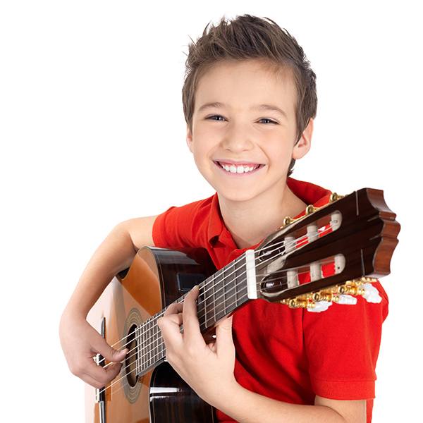 Happy boy is playing on acoustic guitar